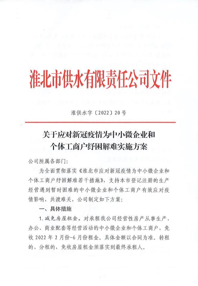 淮北市供水有限責任公司關于應對新冠疫情為中小微企業和個體工商戶紓困解難實施方案 淮供水字【2022】20號