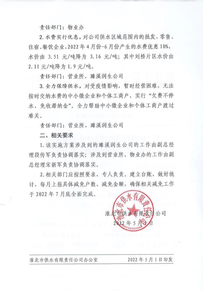 淮北市供水有限責任公司關于應對新冠疫情為中小微企業和個體工商戶紓困解難實施方案 淮供水字【2022】20號