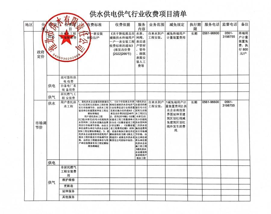 淮北市供水有限責任公司收費項目清單
