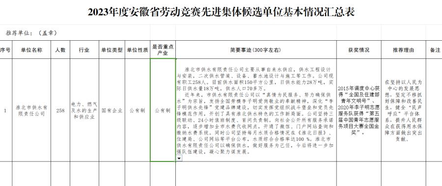 根據省總工會《關于推薦評選 2023 年度安徽省勞動競賽先進集體、先進個人和省五一勞動獎、省工人先鋒號的通知》(皖競字〔2024〕1 號)文件精神,現對申報單位供水公司予以公示。