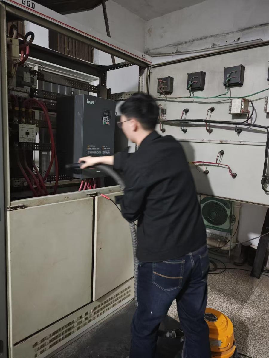 經過仔細檢測,維修人員精準定位問題:變頻器內部灰塵堆積,散熱過慢,導致過熱停機,遠程控制設備電源故障。面對復雜的故障,他們分工明確,一組負責維修變頻器,小心翼翼清理灰塵;另一組全力搶修遠程控制設備,仔細排查、重新接線更換電源。